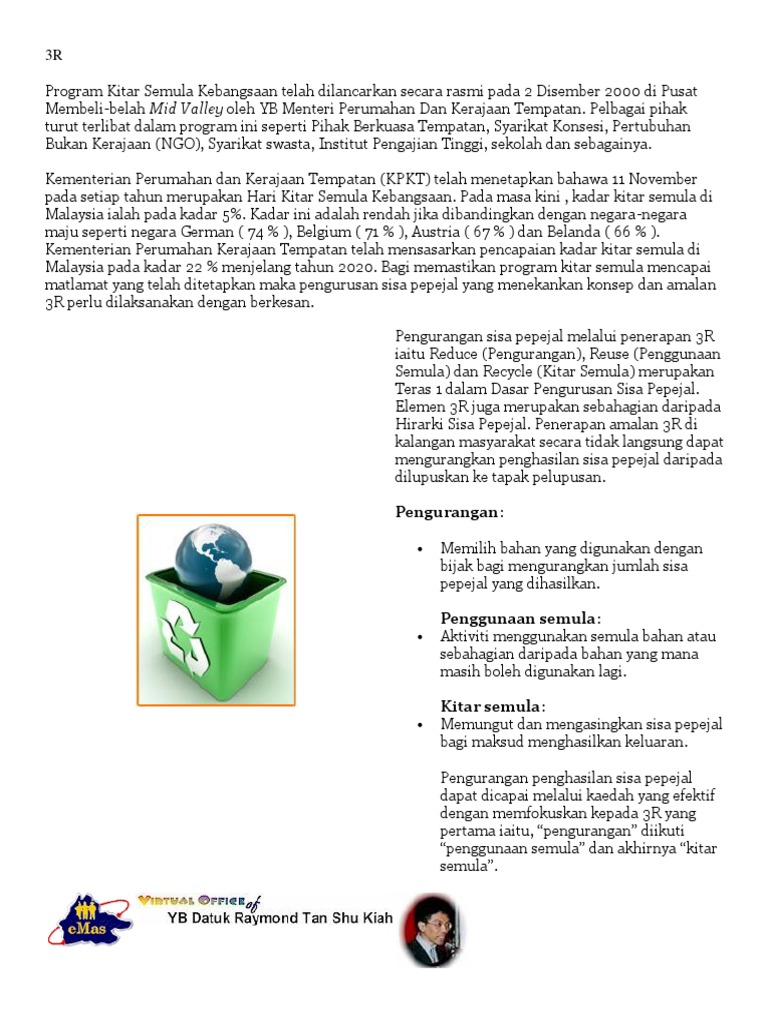 Pelaksanaan ini adalah berdasarkan peraturan di bawah akta pengurusan sisa pepejal dan pembersihan awam 2007 (akta 672) yang denda kompaun maksimum sehingga rm1,000 akan dikenakan jika didapati enggan melaksanakan pengasingan sisa pepejal mulai 1 jun ini. Majlis dirasmikan menteri kesejahteraan bandar, perumahan dan. Sejajar dengan pertambahan penduduk dan kepesatan pembangunan dan pembandaran, perubahan. Dasar pengurusan sisa pepejal negara adalah satu langkah penambahbaikan yang strategic dalam mencapai status negara maju dan pengurusan sisa pepejal yang lebih mapan. Perbadanan pengurusan sisa pepejal dan pembersihan awam, kuantana, pahanga, malaizija — atrašanās vietu kartē, telefons, atsauksmes. Buku garis panduan pengurusan sisa pepejal untuk penganjuran acara. Pembuangan sisa pepejal tanpa kawalan dan tanpa cara yang betul adalah merugikan. Peratusan komposisi sisa pepejal ini dapat menggambarkan permasalahan yang ada dalam amalan pengurusan sisa pepejal di sekolah. Penjanaan sisa pepejal di malaysia semakin meningkat selari dengan pertambahan penduduk pada masa kini. Kejayaan pengurusan sisa pepejal sangat bergantung kepada sejauh manakah masyarakat menyedari dan melibatkan diri dengan mengamalkan kaedah pengurusan sisa pepejal yang betul. Kitar semula, komuniti, pembersihan awam, pengetahuan, pengurusan sisa, sisa pepejal. Setiap sisa buangan anda adalah sumber pendapatan di kala memerlukan. Hal ini menunjukkan bahawa terdapat juga segelintir masyarakat yang memahami kepentingan pengasingan ini dibuat, manakala.
